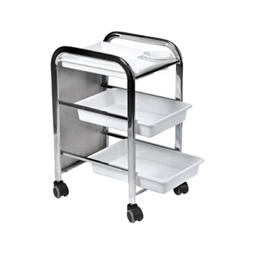 Тележка косметологическая ТК06 практична, компактна и мобильна, а ее универсальный дизайн прост и лаконичен. Устойчивый и прочный металлический каркас данной модели оснащен маневренной колесной базой и удобными ручками для более комфортного перемещения изделия. Верхняя полка идеальна для размещения текстильных материалов, необходимых в работе мастера. Также для удобного хранения аксессуаров и инструментов предусмотрено наличие двух вместительных выдвижных лотков. В целом модель относится к оборудованию открытого типа и может использоваться для оснащения рабочего места мастера любой специализации.