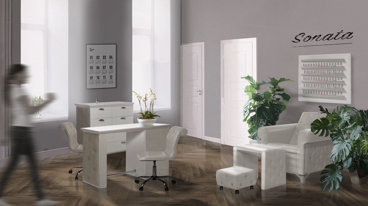 Полка под лаки "Соната". Навесная полка выполнена на едином основании из ламинированного ДСП с отделкой по периметру декоративным молдингом. На основании установлены шесть полочек с ограничителем (бортиком) из матового алюминия.