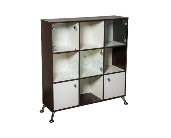 Стеллаж секционный, изготовлен из ламинированного ДСП, дверцы: стекло, ДСП. Ножки хром. Стеллаж изготавливается под заказ. Размер (ДхШхВ):60х33х57