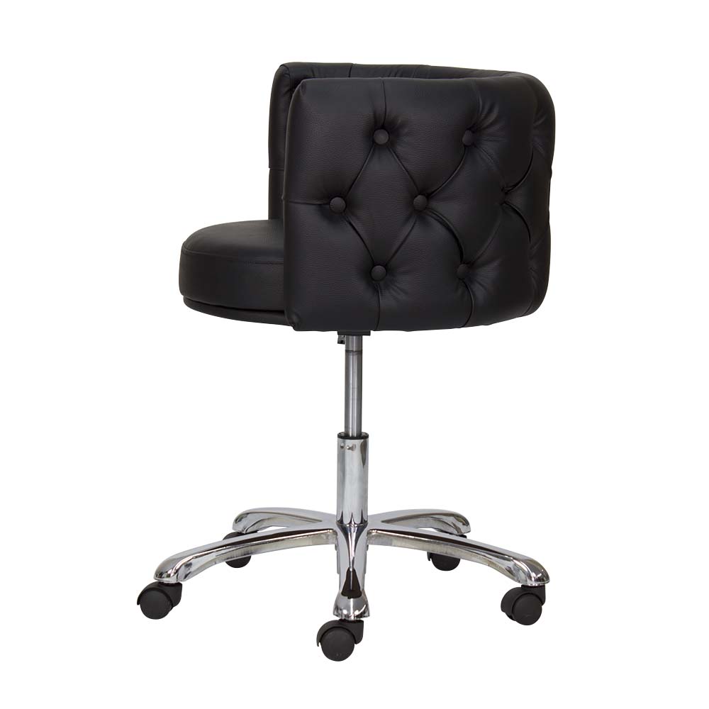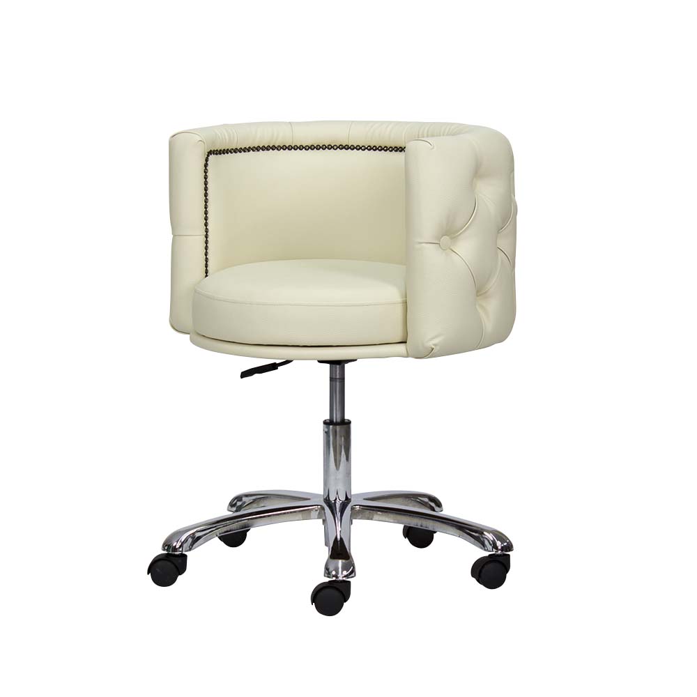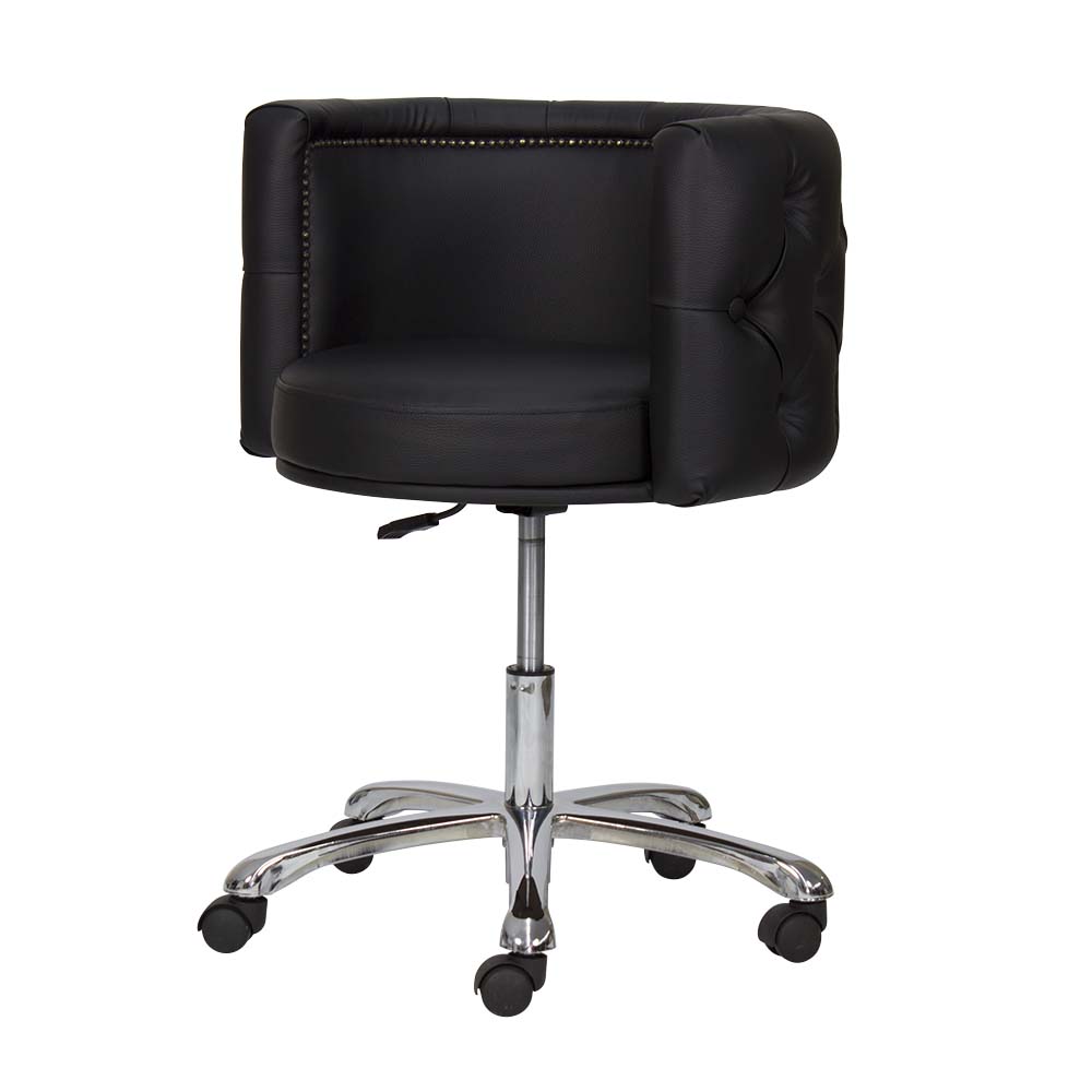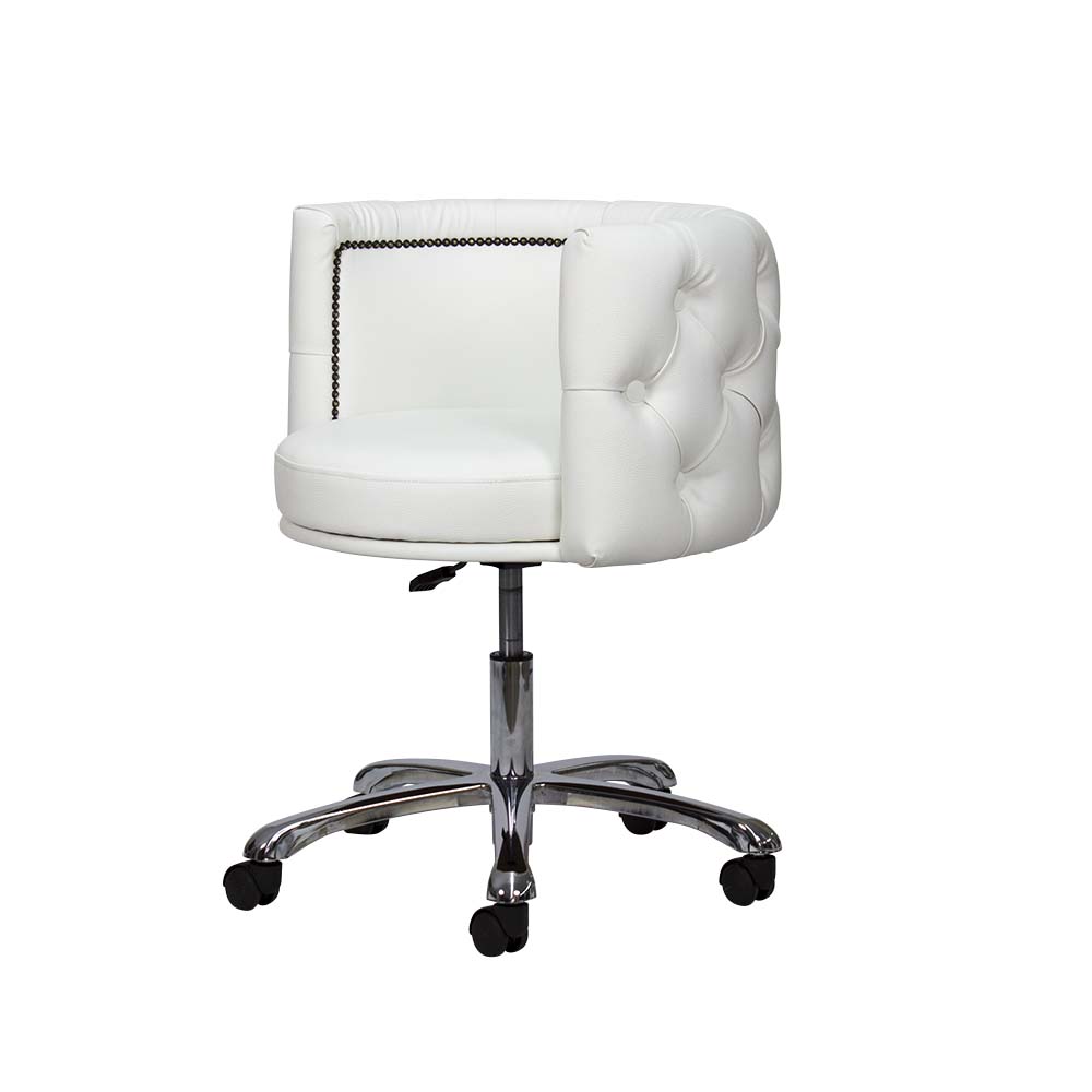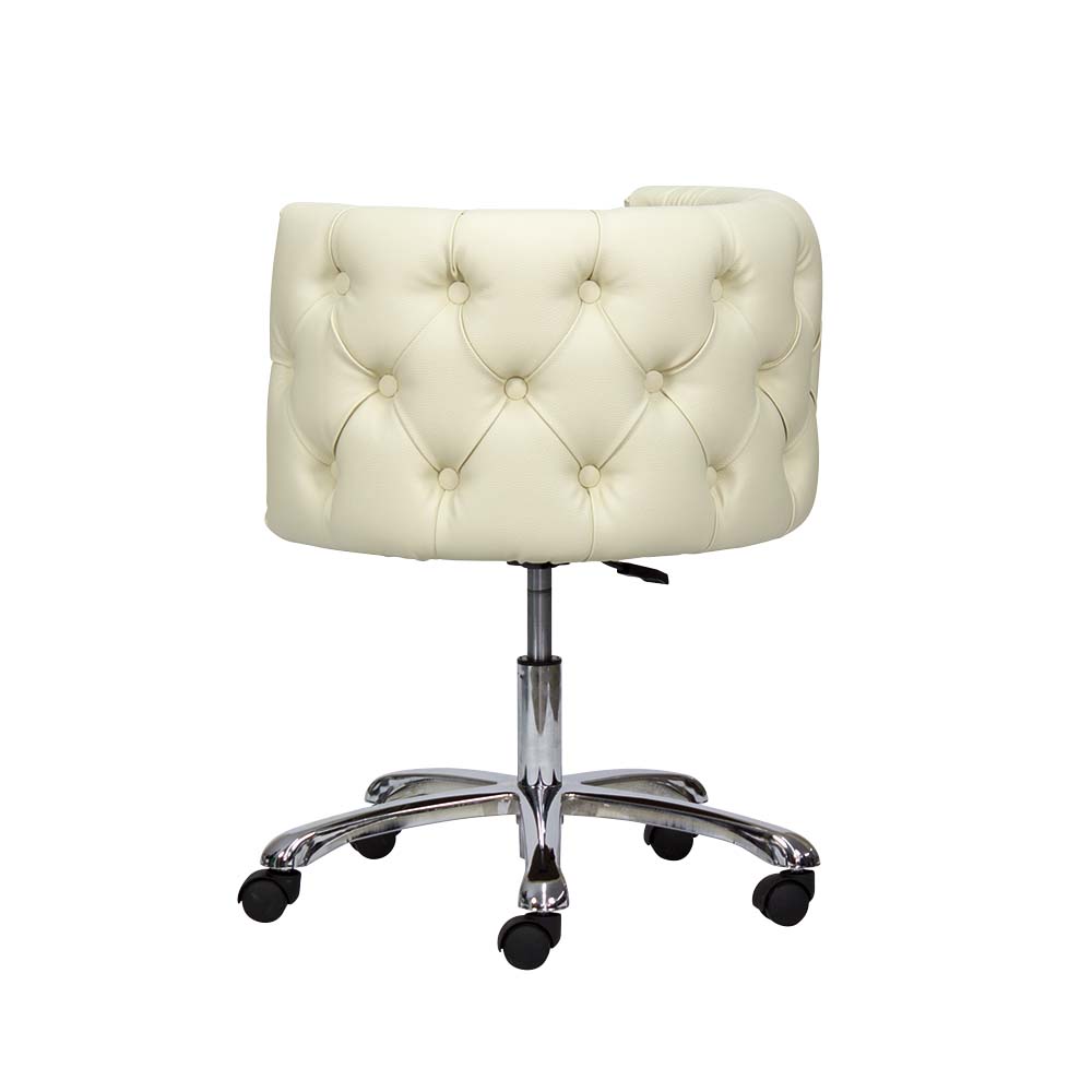 Стул "Деко" Красивый, элегантный стул для мастера или клиента. Полукруглая спинка стула выполняет роль подлокотников. Внешняя сторона декорирована каретной стяжкой с пуговицами в цвет обивки. Стул регулируется по высоте с помощью хромированной пневматики. Пятилучье хромированное, устойчивое, увеличенного диаметра. В этом стульчике с удобством может разместиться мастер маникюра или клиент.