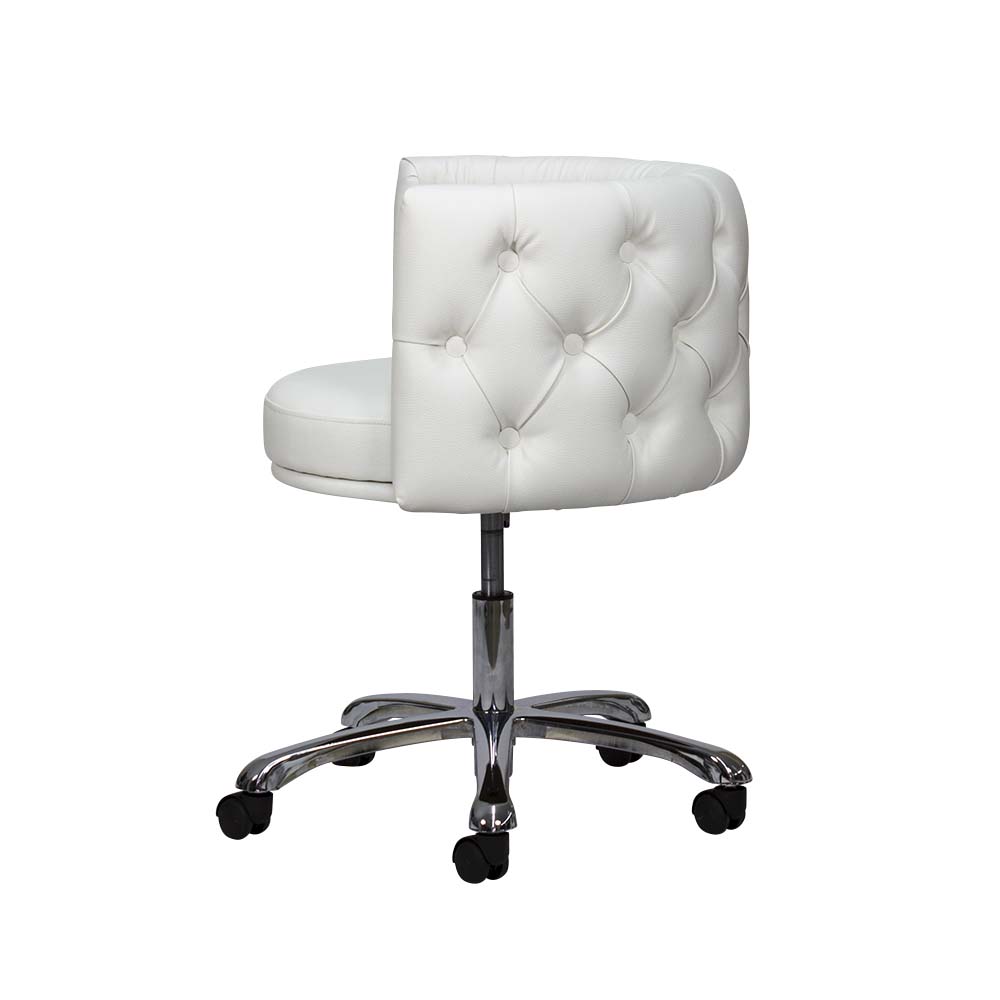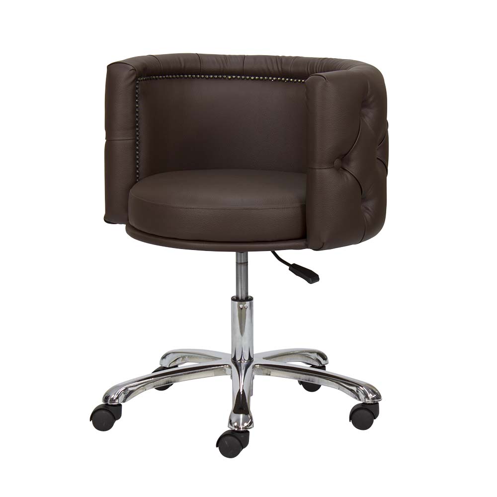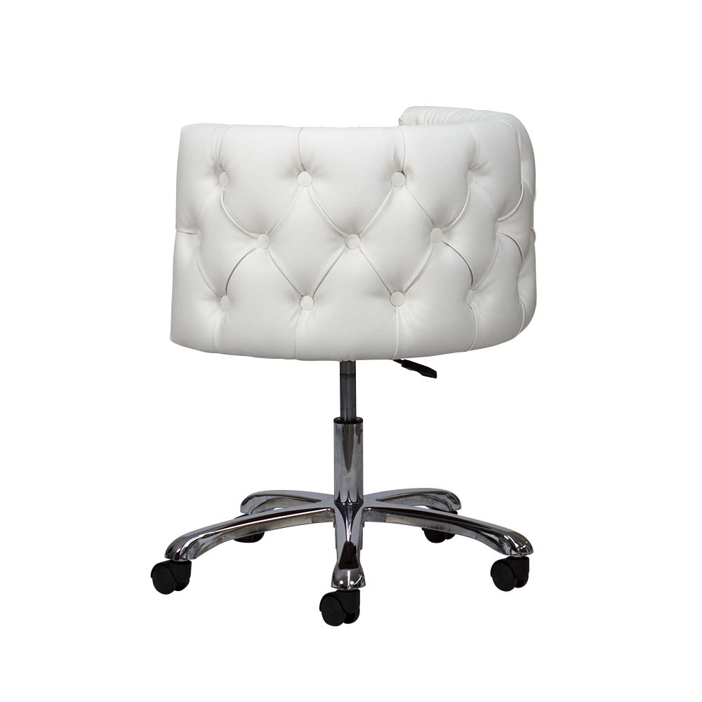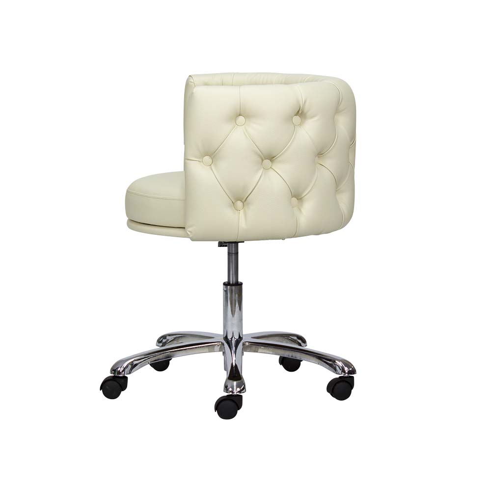 Стул "Деко" Красивый, элегантный стул для мастера или клиента. Полукруглая спинка стула выполняет роль подлокотников. Внешняя сторона декорирована каретной стяжкой с пуговицами в цвет обивки. Стул регулируется по высоте с помощью хромированной пневматики. Пятилучье хромированное, устойчивое, увеличенного диаметра. В этом стульчике с удобством может разместиться мастер маникюра или клиент.