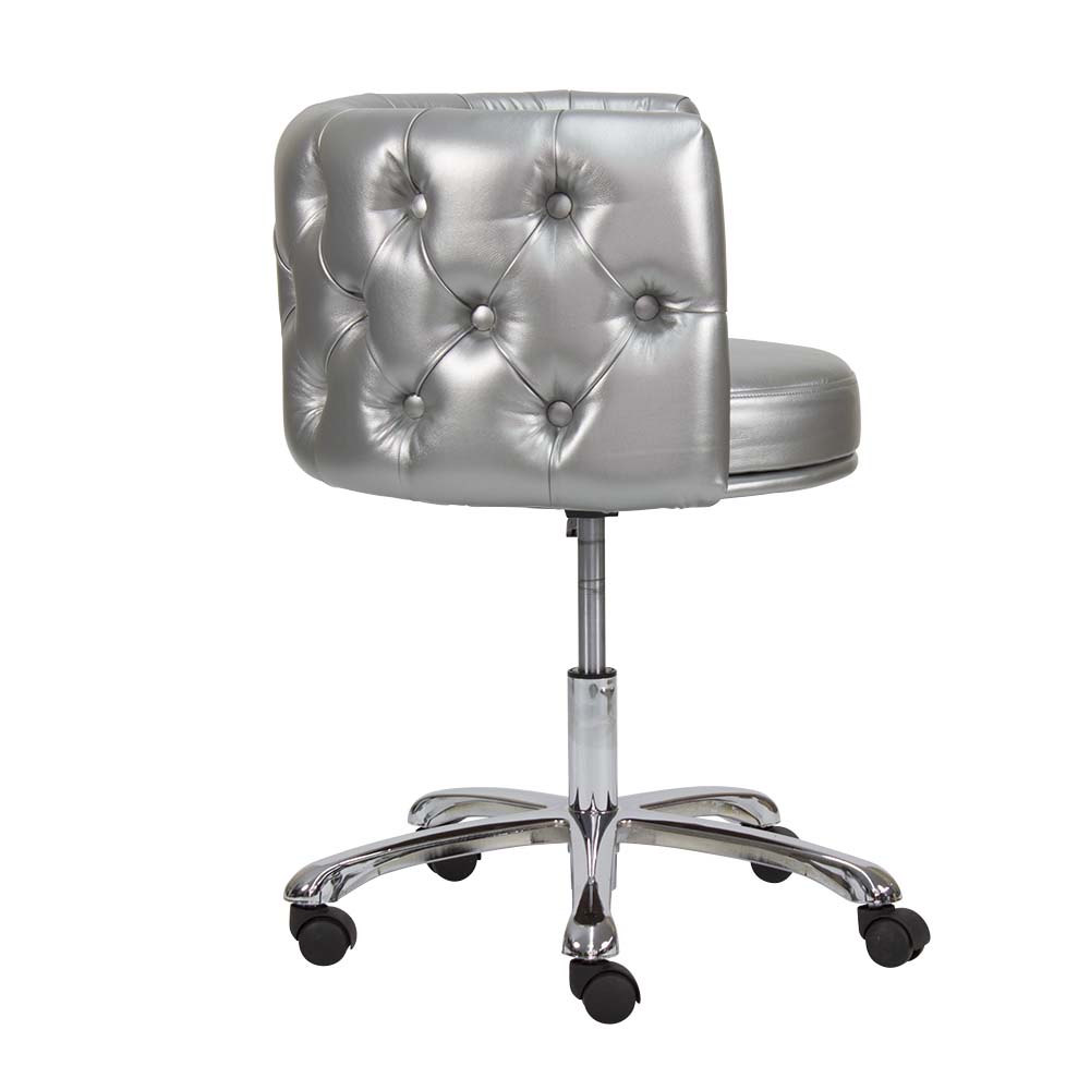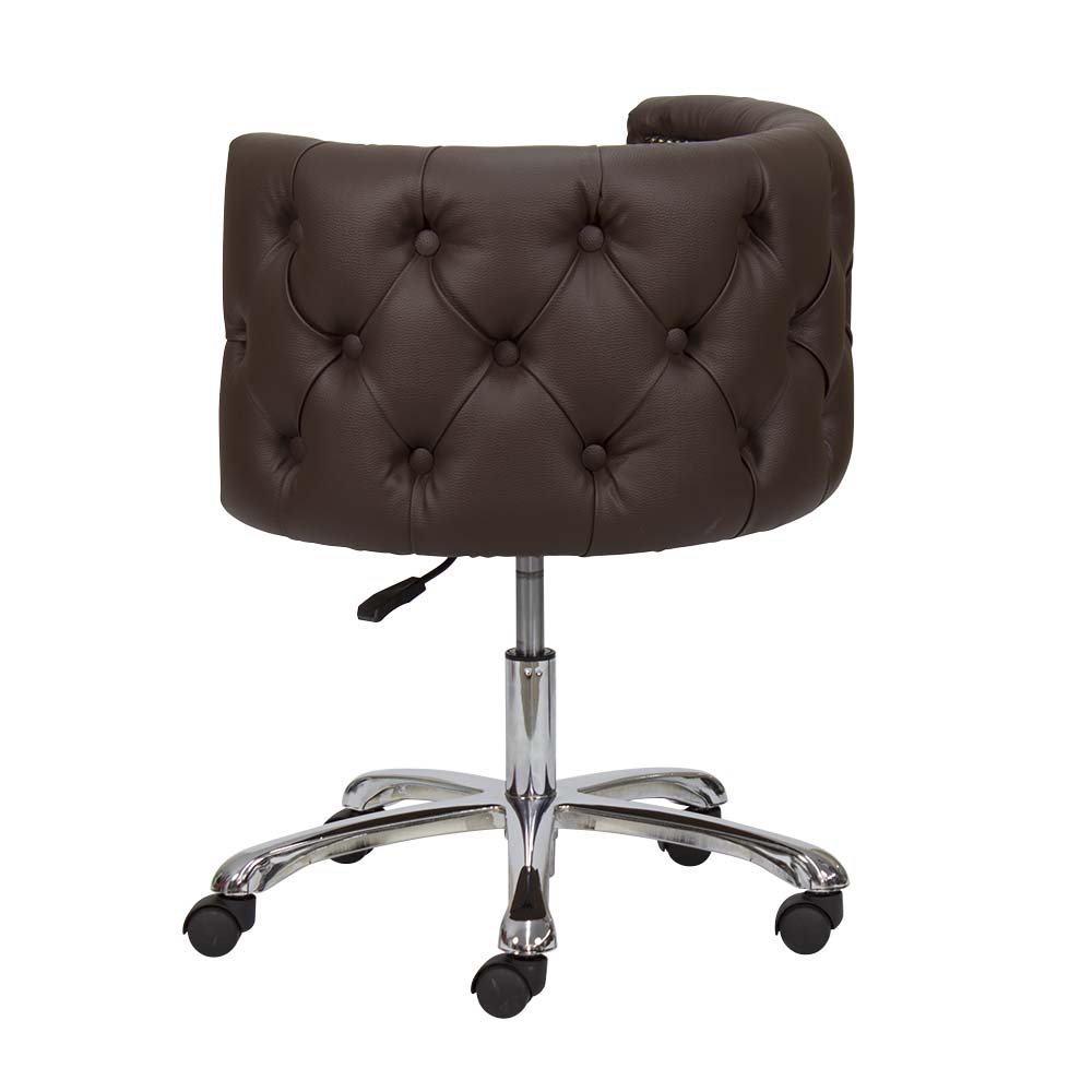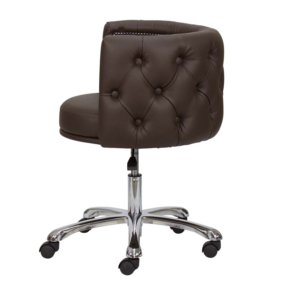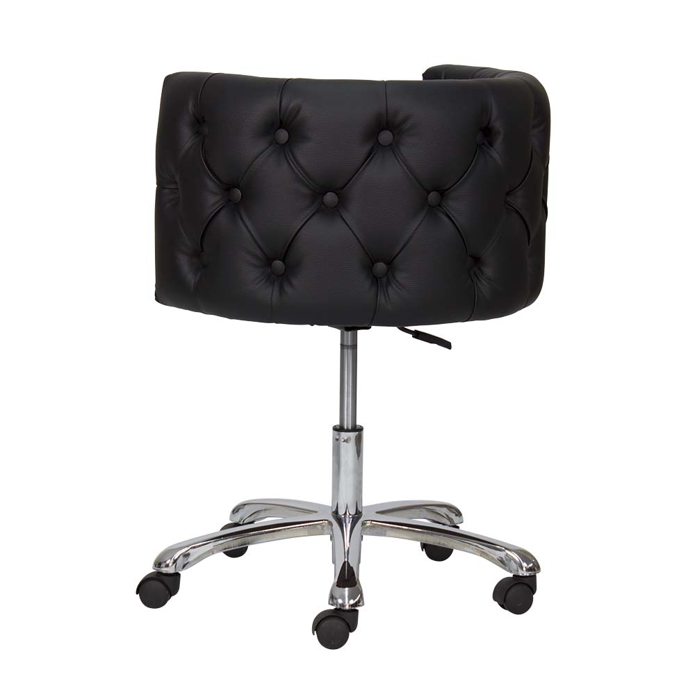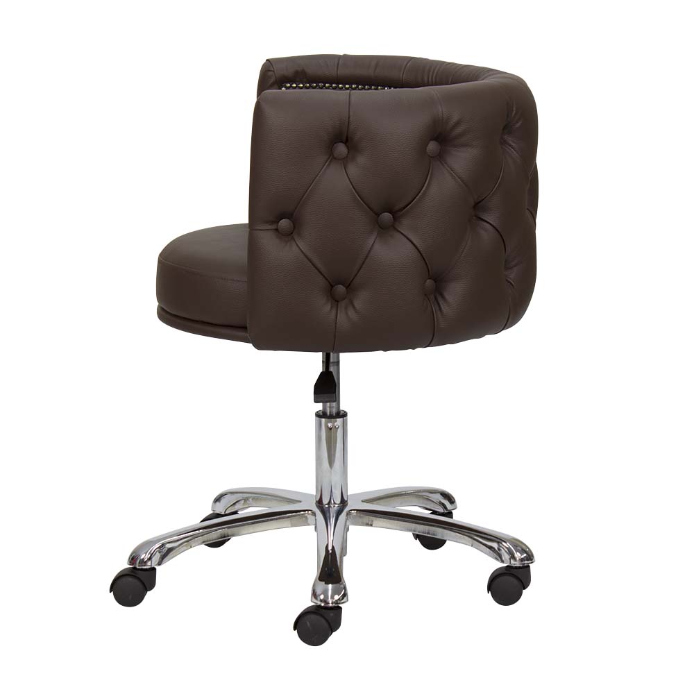 Стул "Деко" Красивый, элегантный стул для мастера или клиента. Полукруглая спинка стула выполняет роль подлокотников. Внешняя сторона декорирована каретной стяжкой с пуговицами в цвет обивки. Стул регулируется по высоте с помощью хромированной пневматики. Пятилучье хромированное, устойчивое, увеличенного диаметра. В этом стульчике с удобством может разместиться мастер маникюра или клиент.