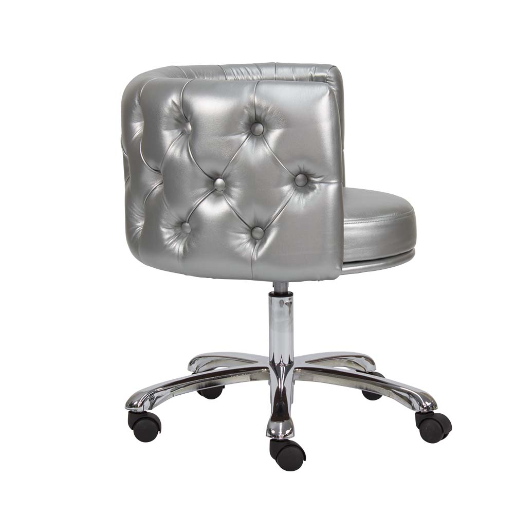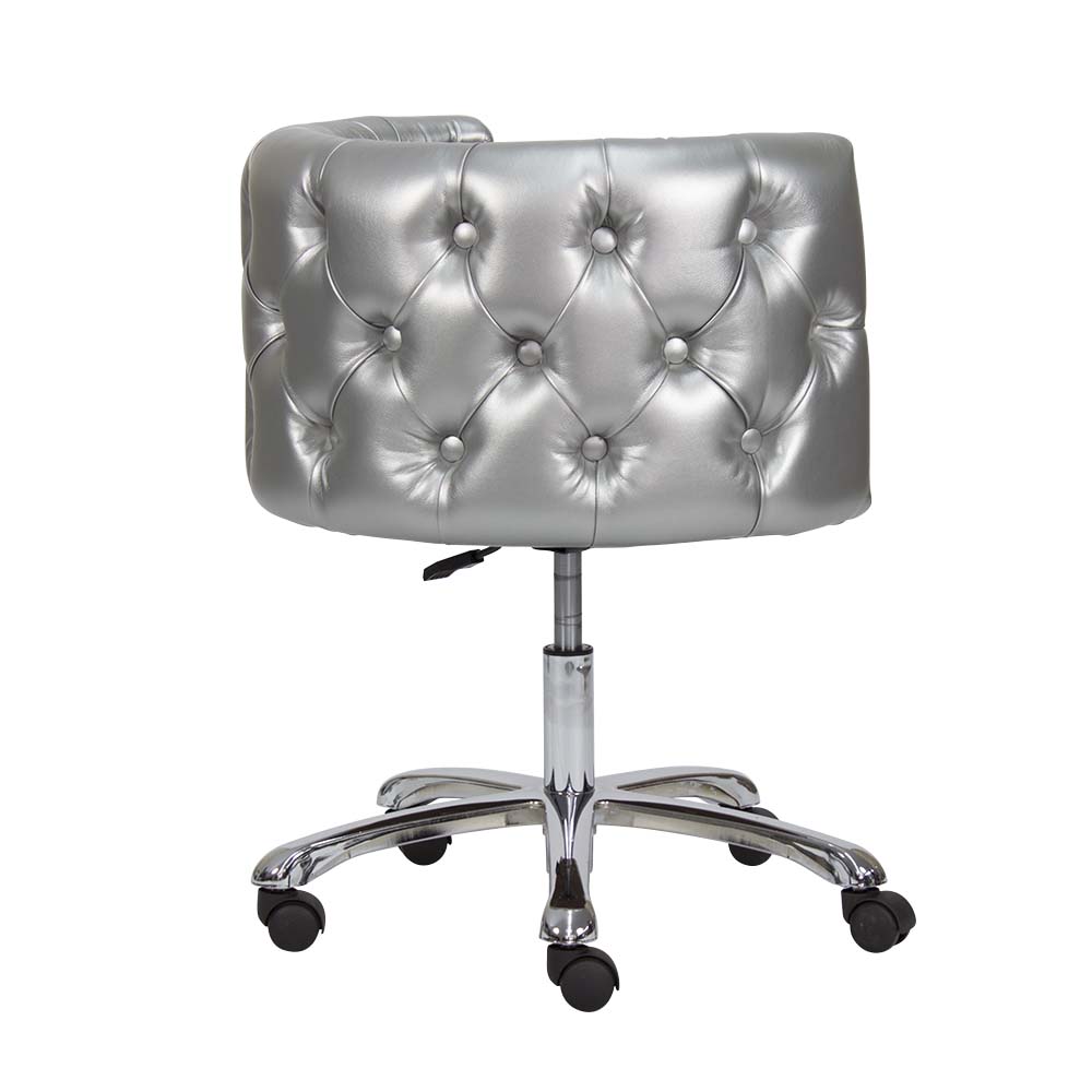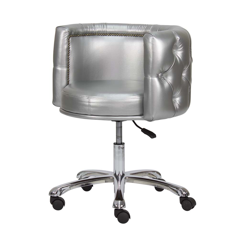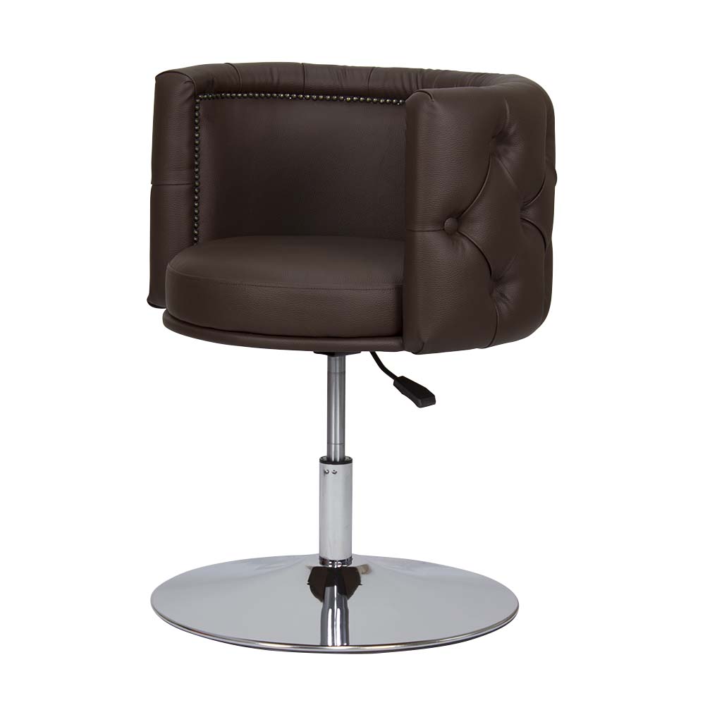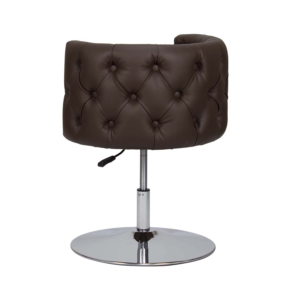 Стул "Деко" Красивый, элегантный стул для мастера или клиента. Полукруглая спинка стула выполняет роль подлокотников. Внешняя сторона декорирована каретной стяжкой с пуговицами в цвет обивки. Стул регулируется по высоте с помощью хромированной пневматики. Пятилучье хромированное, устойчивое, увеличенного диаметра. В этом стульчике с удобством может разместиться мастер маникюра или клиент.