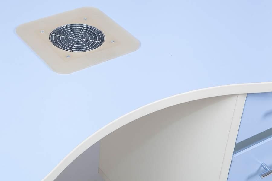 Наличие вытяжки в маникюрном кабинете является обязательным условием безопасной работы. Данная модель врезного типа является надежным изделием, которое сохраняет свои качества в течение длительного срока эксплуатации. Кроме того, такая вытяжка не занимает площадь рабочего места на столе. Поэтому она идеально подходит для помещений с малой площадью.