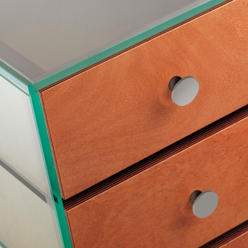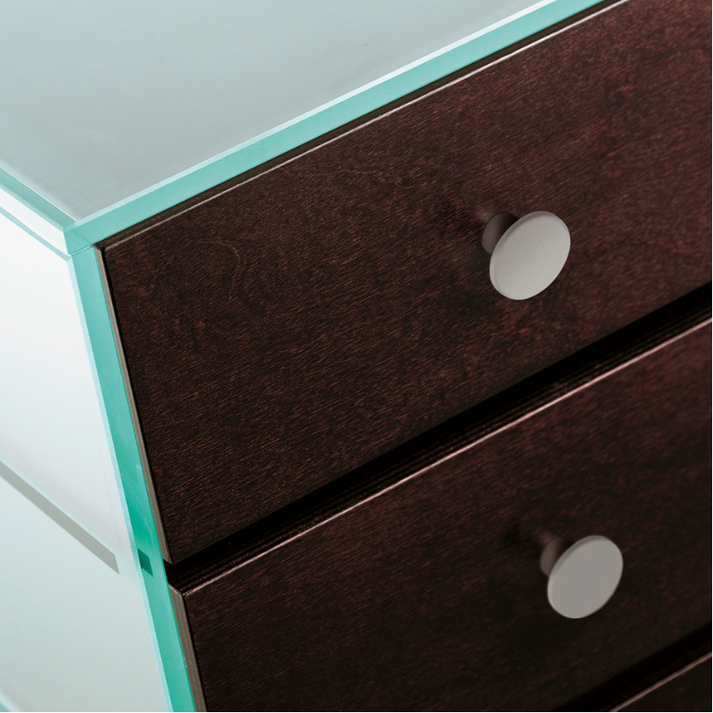 Маникюрный стол "185 L" - элегантный маникюрный стол со столешницей из матового и закаленного стекла и тумбой с 2 ​​ящиками и 1 деревянной коробкой, в комплекте с лампой, подушкой для рук и держателем для лака.