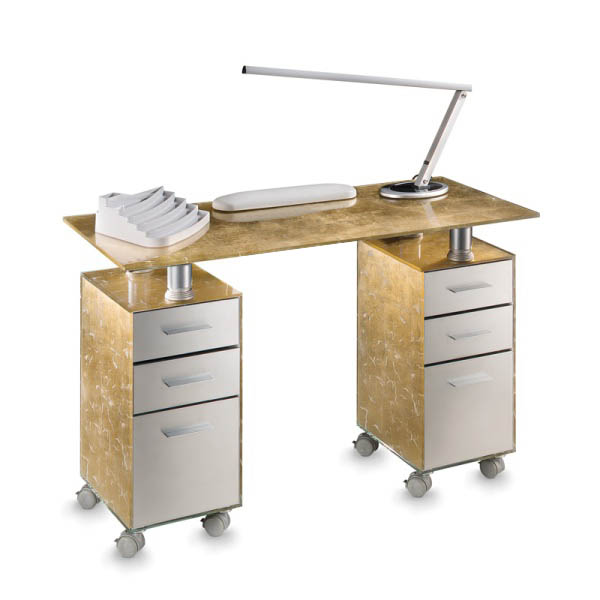 <div><strong>Стол маникюрный "191 L" </strong>- с двумя тумбами, столешница и тумбы из стекла. Тумбы маникюрного стола <span style="font-family: arial, verdana, sans-serif;">с артикулом <strong>A-</strong></span><strong>м60003093</strong><span style="font-family: arial, verdana, sans-serif;"> </span>оснащены тремя выдвижными ящиками из металла и колесами со стопорами для удобства перемещения. В комплекте: лампа, валик маникюрный, подставка под лаки.</div> <div> </div> <div>Цвет стекла:</div> <div>- Gold leaf. </div> <div> </div> <div>Вес: 86 кг;</div> <div>Объем: 0,52 м³;</div> <div>Количество мест: 4.</div> <div> </div> <div>Размер (ДхШхВ): 115x50x76 см</div>