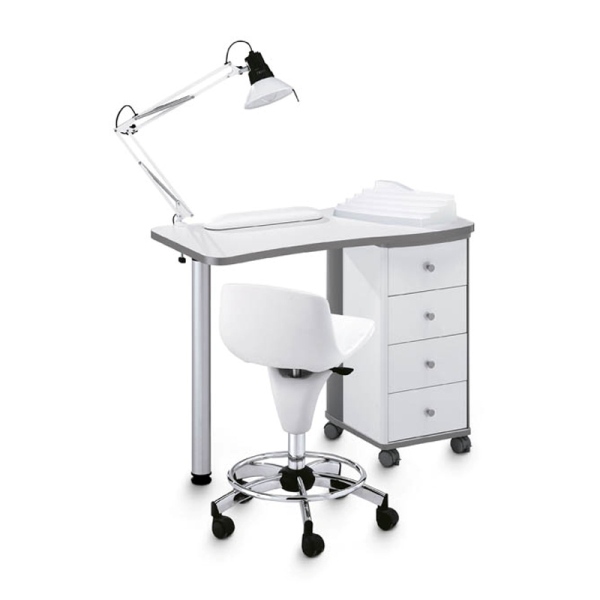 Стол маникюрный "204 L" - с одной тумбой, столешница и тумба из дерева. Тумба маникюрного стола с артикулом A-м60003116 имеет серые вставки, кромка столешницы серого цвета. Опорная нога серая глянцевая. Тумба маникюрного стола оснащена четырьмя выдвижными ящиками и колесами со стопорами для удобства перемещения. В комплекте: лампа, валик маникюрный, подставка под лаки.