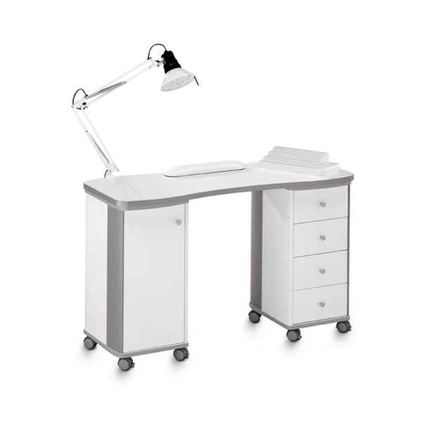 <div><strong>Стол маникюрный "217 L"</strong> - с двумя тумбами, столешница и тумбы из дерева. Тумбы маникюрного стола <span style="font-family: arial, verdana, sans-serif;">с артикулом <strong>A-</strong></span><strong>м60003110</strong><span style="font-family: arial, verdana, sans-serif;"> </span>имеют серые вставки, кромка столешницы серого цвета. Одна тумба маникюрного стола оснащена четырьмя выдвижными ящиками, другая тумба оснащена распашной дверцей и полками. Тумбы маникюрного стола имеют колеса со стопорами для удобства перемещения. В комплекте: лампа, валик маникюрный, подставка под лаки.</div> <div> </div> <div>Цвет:</div> <div>- белый.</div> <div> </div> <div>Вес: 55,50 кг;</div> <div>Объем: 0,48 м³;</div> <div>Количество мест: 4.</div> <div> </div> <div>Размер (ДхШхВ): 122x48x74 см</div>