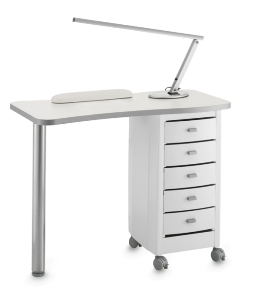 Стол маникюрный "224 L" - с одной тумбой, столешница из дерева, тумба из пластика. Кромка столешницы серого цвета. Опорная нога серая глянцевая. Тумба маникюрного стола с артикулом A-м60003122 оснащена пятью выдвижными ящиками и колесами со стопорами для удобства перемещения. В комплекте: лампа, валик маникюрный, подставка под лаки.
