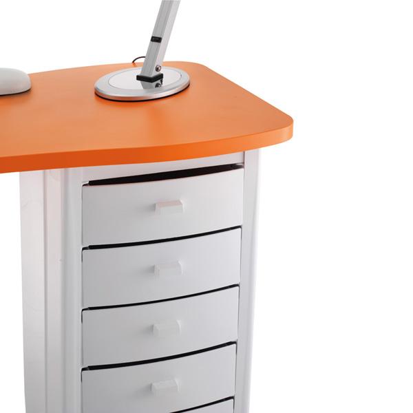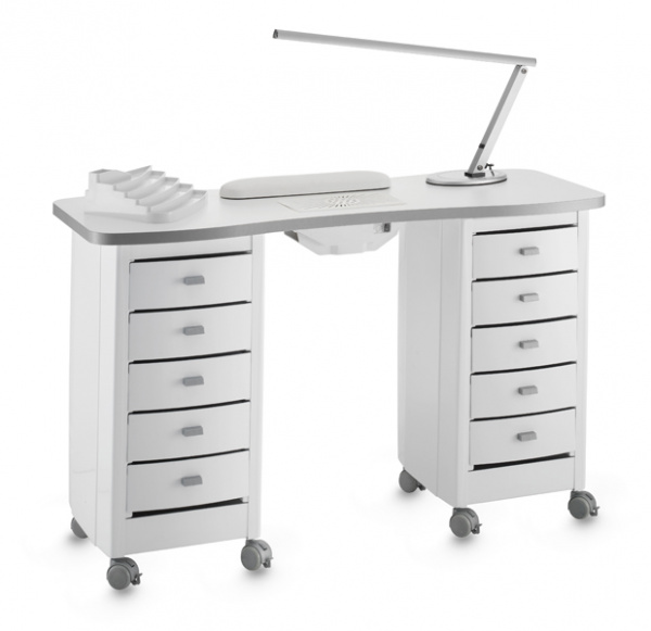 Стол маникюрный "227 LX" - с двумя тумбами, столешница из дерева, тумбы из пластика. Кромка столешницы серого цвета. Тумбы маникюрного стола с артикулом A-м60003127 оснащены пятью выдвижными ящиками и колесами со стопорами для удобства перемещения. В комплекте: лампа, валик маникюрный, подставка под лаки, вытяжка AR1 20W.