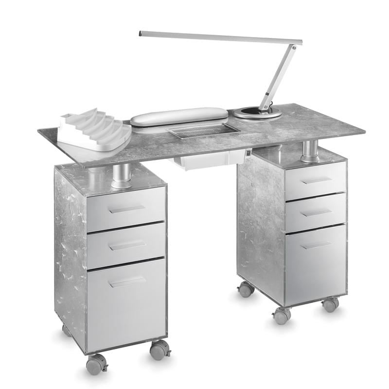 Маникюрный стол с двумя тумбами, без вытяжки, столешница из стекла, тумбы из стекла, каждая с тремя выдвижными ящиками из металла, на колесах.В комплекте: лампа, подушка маникюрная, подставка под лаки.Цвета стекла: Silver leafРазмер (ДхШхВ): 115х50х76 смВес: 86 кг;Объем: 0,51 м³.