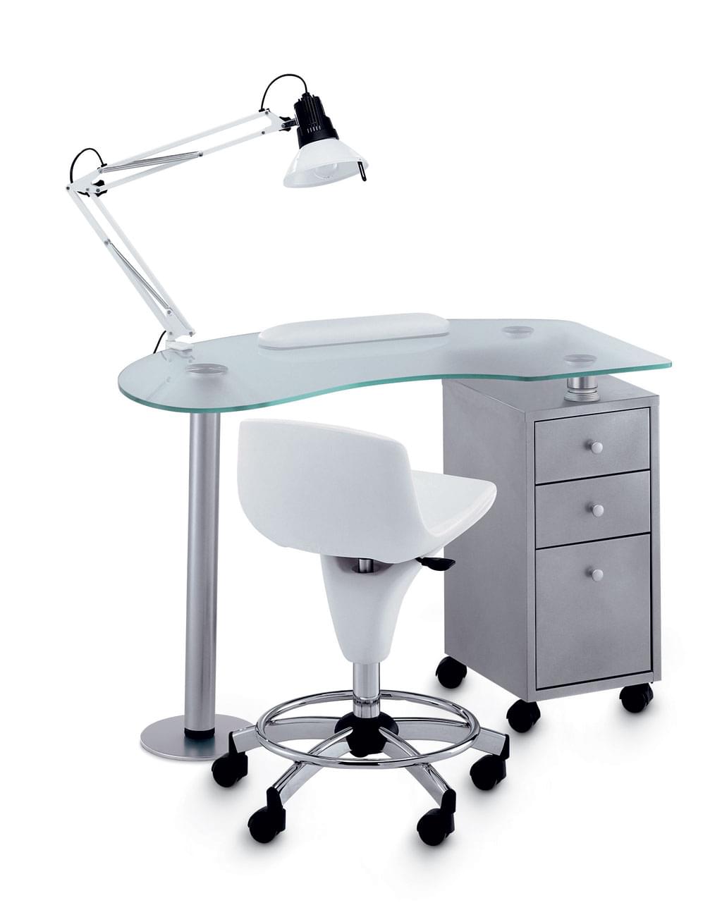 Маникюрный стол с одной тумбой и стеклянной столешницей. Тумба металлическая серого цвета на колесах с тремя выдвижными ящиками. В комплекте: лампа, подушка для маникюра, подставка для лаков. Размер: 110х55х72