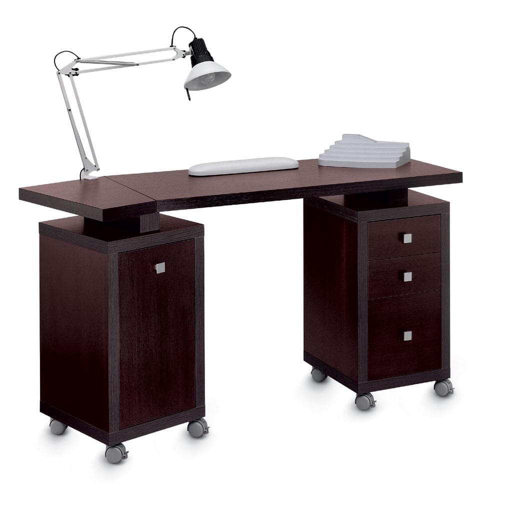 Маникюрный стол с двумя тумбами, столешница ламинированная, тумбы ДСП с 3 - мя выдвижными ящиками, на колесах. В комплекте: лампа, подушка маникюрная, подставка под лаки. Цвет стола: венге или белый. Размер: 148x56x79