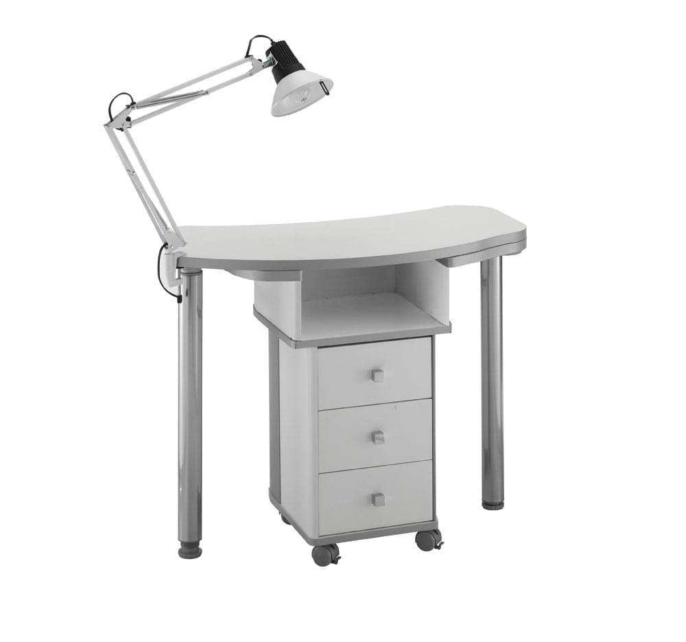 Маникюрный стол с одной тумбой, столешница ламинированная, тумба ДСП с 3 - мя выдвижными ящиками, на колесах. В комплекте: лампа, подушка маникюрная, подставка под лаки. Цвет стола: белый. Размер: 95х55x76,5