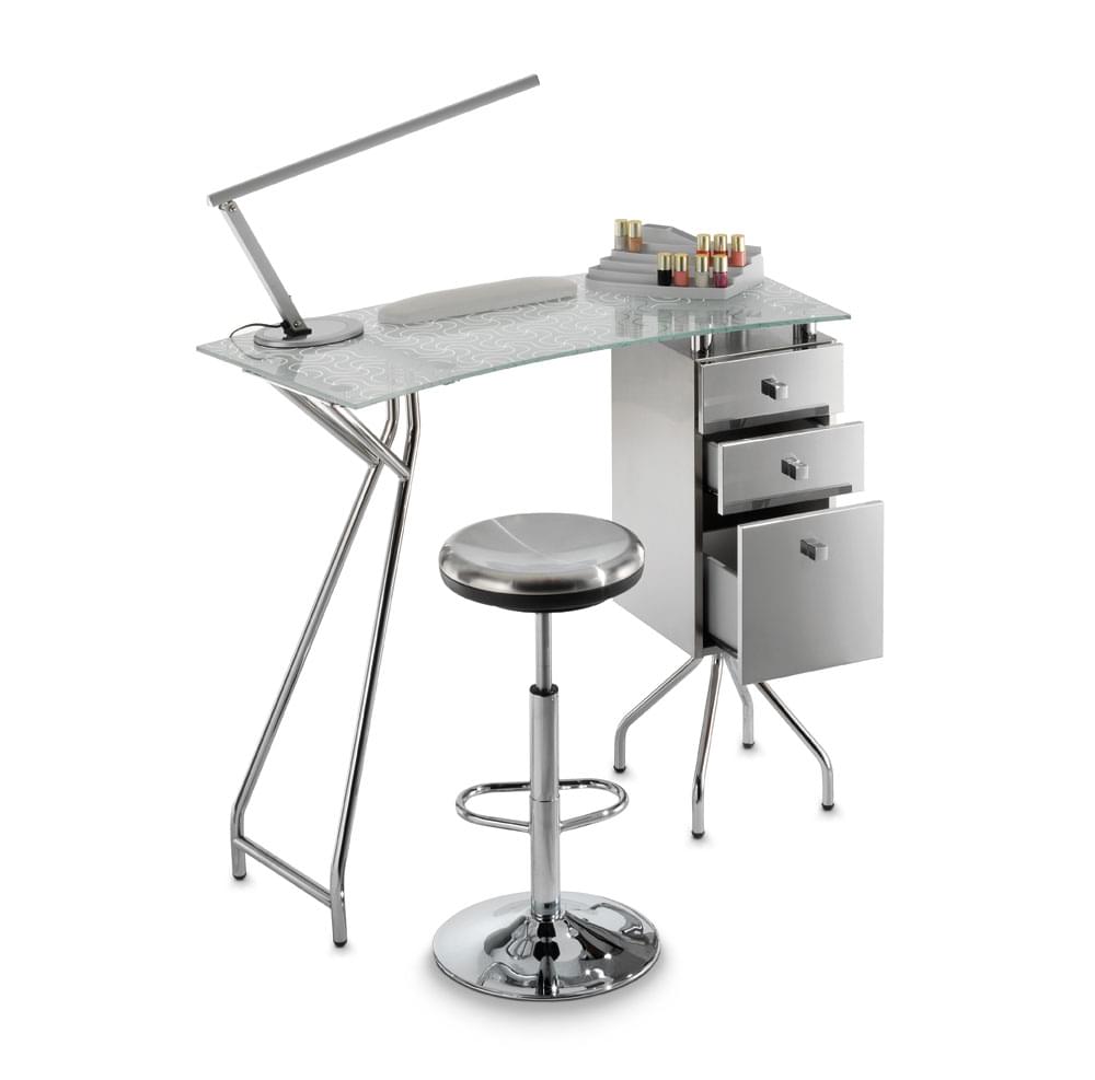 Нейл-бар с одной тумбой, столешница белая стеклянная, тумба из дерева с металлическим покрытием (хром), с выдвижными ящиками. В комплекте: вытяжка, лампа, подушка маникюрная, подставка под лаки. Размер: 110х50x98