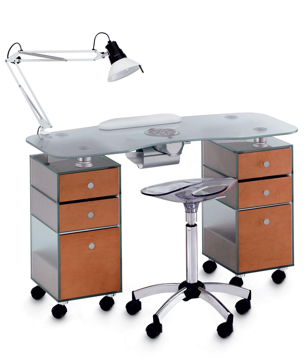 Маникюрный стол с двумя тумбами, столешница из стекла, тумбы из стекла каждая с тремя выдвижными ящиками из дерева, на колесах. В комплекте: лампа, подушка маникюрная, подставка под лаки. Цвет тумбы: стекло с ящиками венге или вишня. Размер: 122х55x72