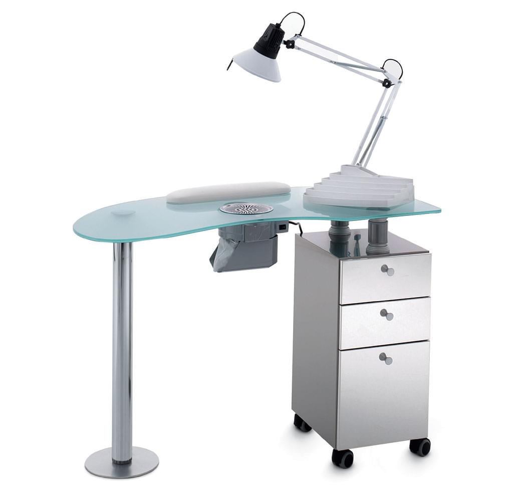 Маникюрный стол с одной тумбой и вытяжкой, столешница из стекла, тумба из металла с тремя выдвижными ящиками, на колесах. В комплекте: лампа, подушка маникюрная, подставка под лаки. Стандартный цвет тумбы: серый. Возможен вариант без вытяжки. Размер: 110x55x72