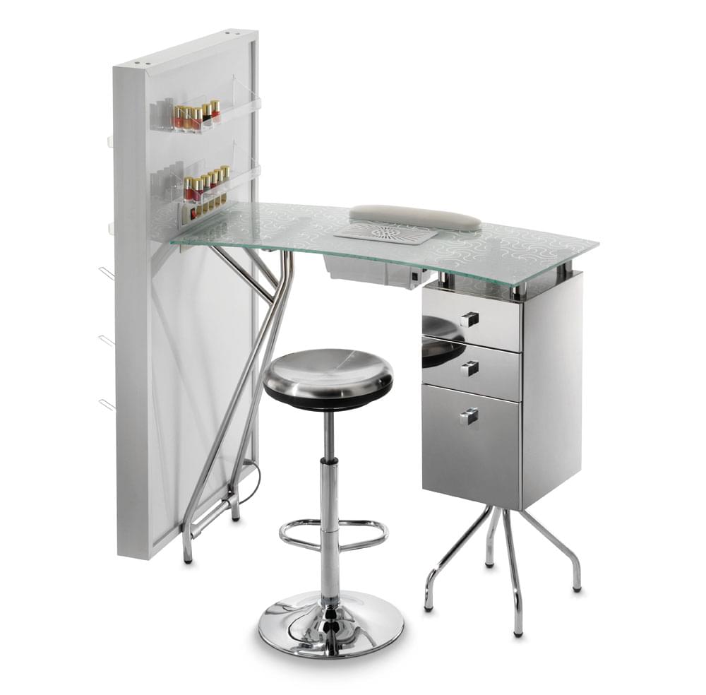 Нейл-бар с одной тумбой, вытяжкой, столешница белая стеклянная, тумба из дерева с металлическим покрытием, с выдвижными ящиками, сбоку витрина с полочками. В комплекте: лампа, подушка маникюрная, подставка под лаки. Размер: 110х50x98, витрина: 75х10х140