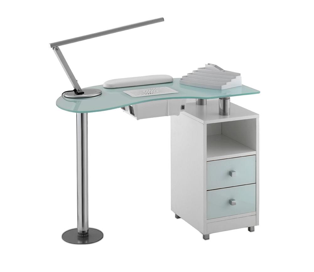 Маникюрный стол с одной тумбой, столешница из стекла, тумба из дерева цвета венге или белого с двумя выдвижными ящиками и полкой, на колесах. Фронтальная часть ящиков покрыта стеклом. В комплекте: вытяжка, лампа, подушка маникюрная, подставка под лаки. Возможен вариант без вытяжки. Размер:110x55x77