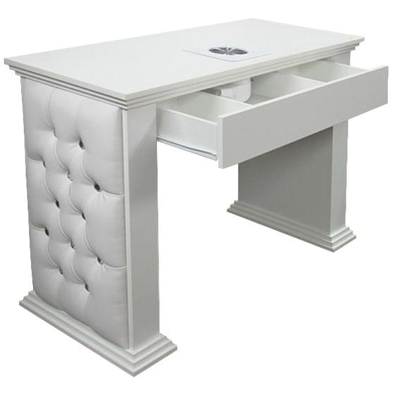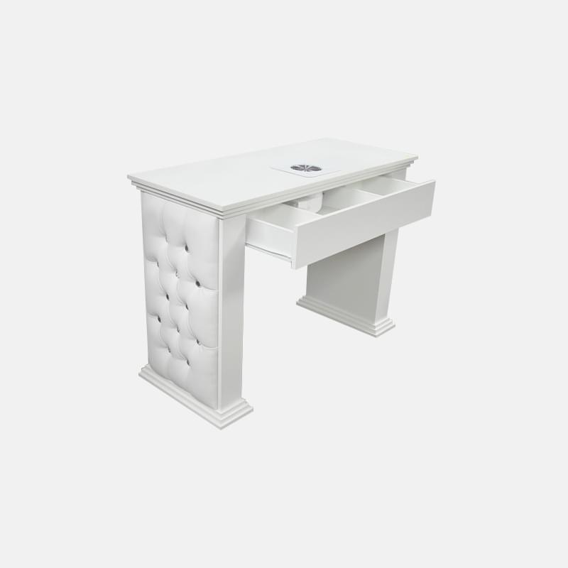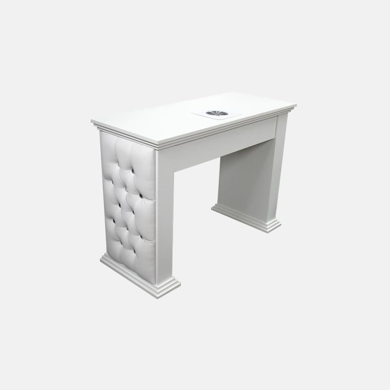 Можно установить вытяжку для большей стерильности и чистоты. На столешнице достаточно места для лампы, стойки с лаками, УФ-лампы и прочего. Внешние стороны стола украшены каретной стяжкой, что добавляет оригинальности и объема. Цвета и габариты модели покупатель может выбрать самостоятельно.
