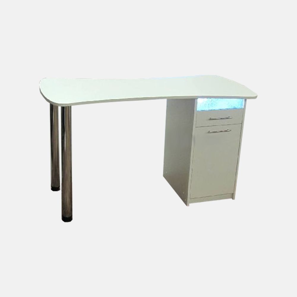 Стол и столешница из прочного и износостойкого ЛДСП, две ножки в виде хромированных труб. Рассчитан для одного рабочего места. Есть тумба для хранения маникюрных принадлежностей. Имеется встроенная ультрафиолетовая лампа для дезинфекции. Электрической розеткой стол не оборудован. Данная опция производится за отдельную плату. Маникюрный стол можно заказать по индивидуальным размерам и в любой цветовой гамме из имеющихся в каталоге. Конечная стоимость изделия может отличаться от указанной базовой. Производитель имеет право изменять внешний вид товара на собственное усмотрение.