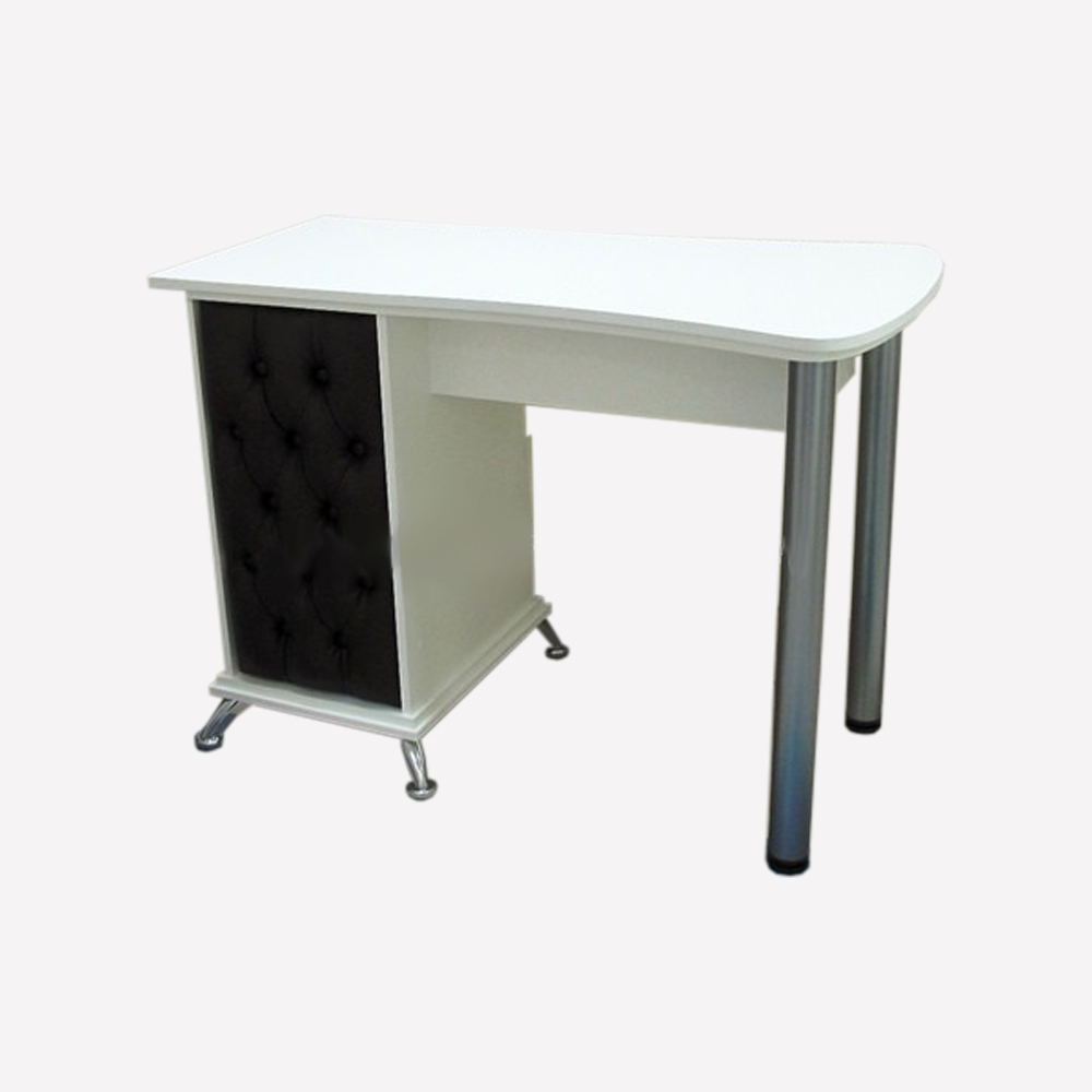 Одноместный рабочий стол с тумбой, имеет две ножки из хромированных труб. Материал производства - ЛДСП высокого качества, устойчивый к повреждениям. Лицевая часть стола оформлена из кожи в стиле «каретной стяжки». Варианты цветовых сочетаний могут варьироваться в зависимости от предпочтений заказчика. Оснащен двумя встроенными ящиками и полками. Есть возможность добавить в комплектацию ультрафиолетовую лампу и электрическую розетку за дополнительную оплату. Производитель оставляет за собой право менять внешний вид изделия без предупреждения об этом заказчика.