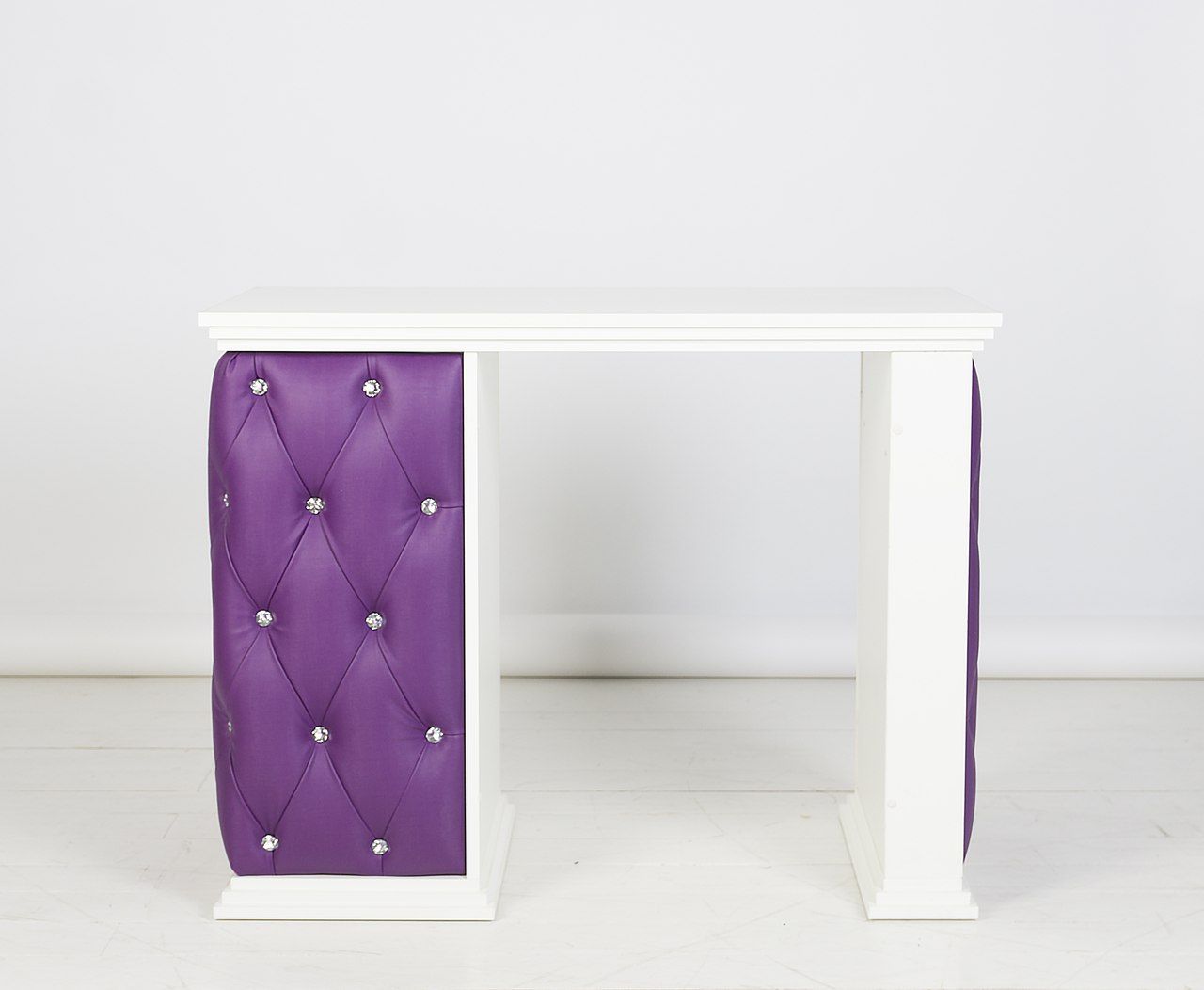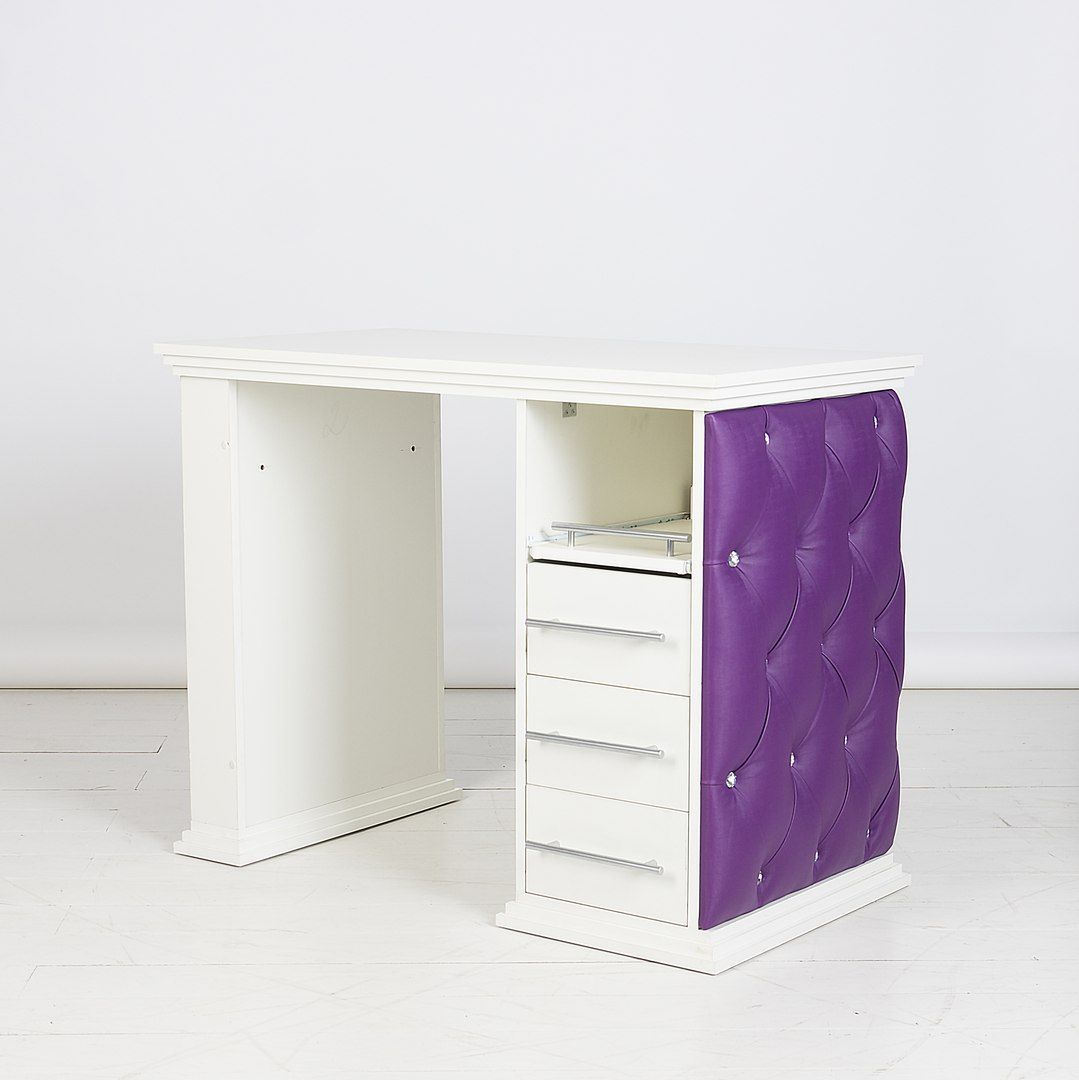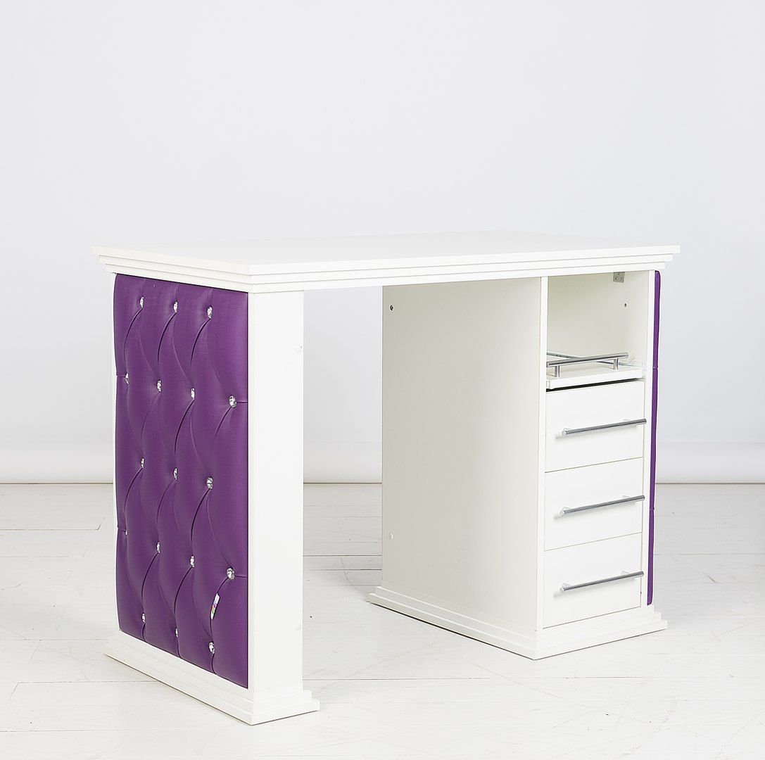 Вместительная тумба позволяет разместить здесь различные инструменты и материалы для работы. Столешница достаточно большая по площади, что позволяет расположить лампу, вытяжку и прочие рабочие элементы. Визуально столик тоже привлекателен. Идеи минимализма удачно дополняются каретной стяжкой, что придает изысканности и стиля.