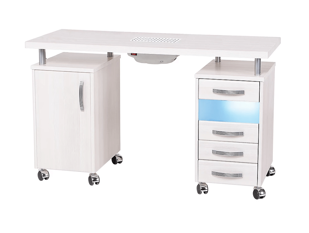 - Комплектация: в одной тумбе единое отделение, в другой тумбе 4 ящика (один с УФО-блоком).