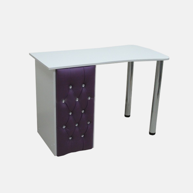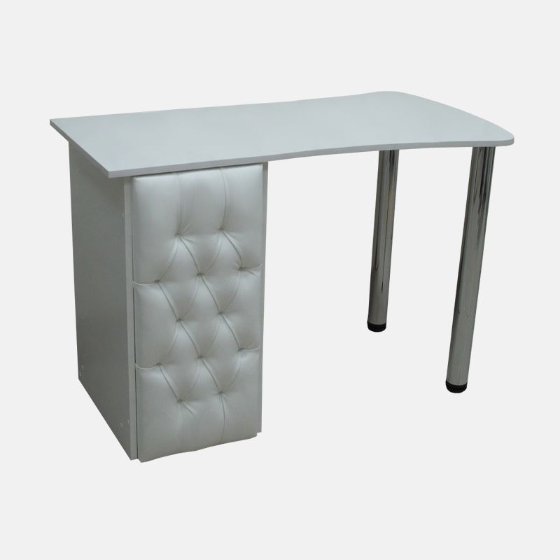 Стол выполнен из износостойкого ЛДСП, декорирован с лицевой стороны кожей в виде каретной стяжки, есть две ноги в виде хромированных труб. Столешница из ЛДСП, цвета материалов производства можно выбрать по каталогу и использовать в любых сочетаниях. Рассчитан данный маникюрный стол на одно рабочее место. Имеется вместительная тумба для маникюрных принадлежностей, выкатная полочка. Любые улучшения базовой модели, например, в виде встроенных электрических розеток или вытяжки, а также прочего возможно за дополнительную плату. Производитель оставляет за собой право изменять внешний вид изделий по собственному усмотрению.