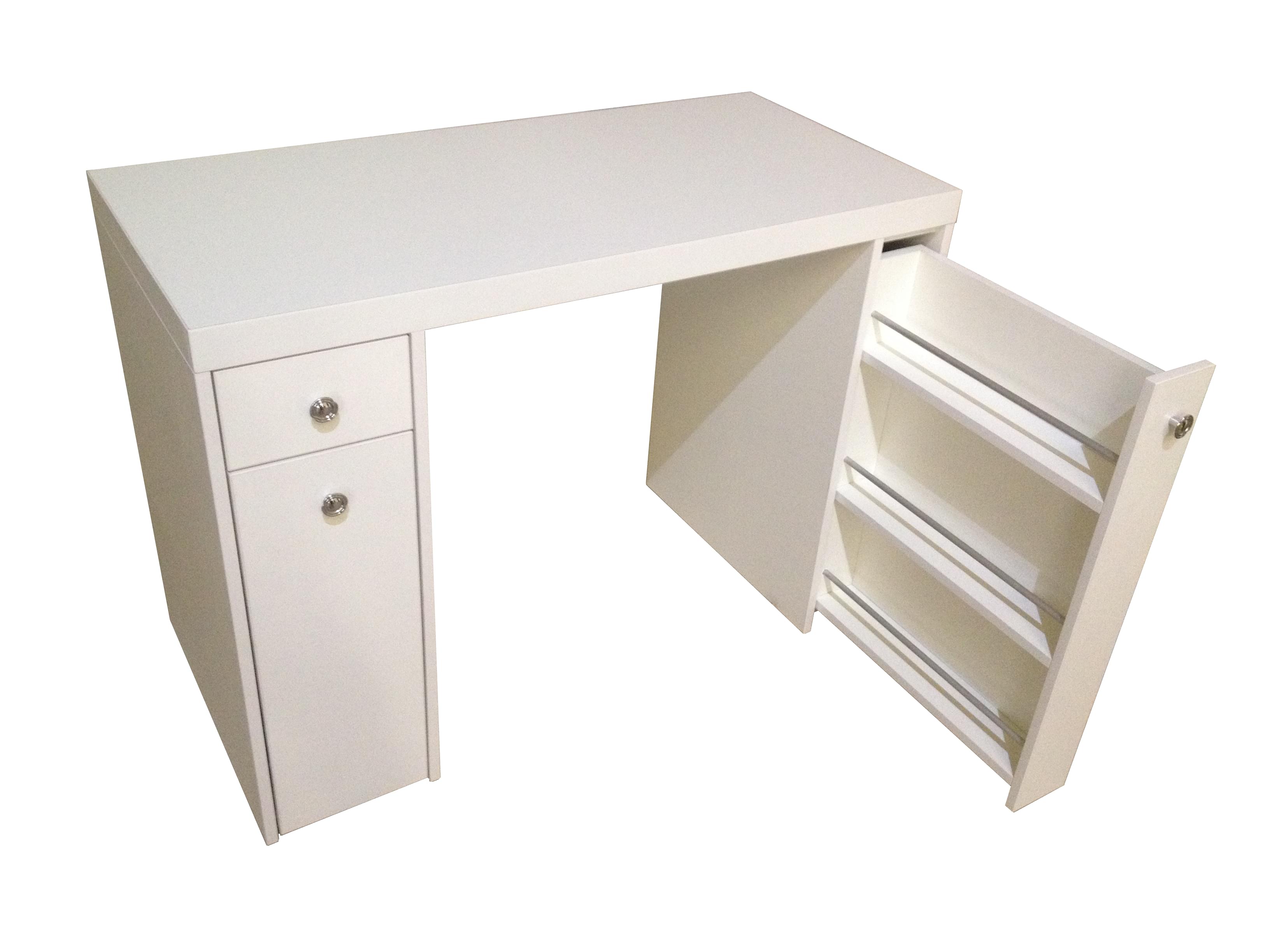 Правая тумба оснащена боксом с тремя уровнями выдвижных полок для флаконов, лаков и бутылок (хранения в вертикальном состоянии).