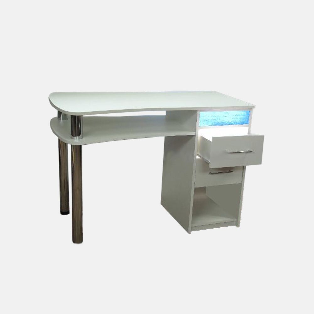 Этот маникюрный стол функционален и удобен. В первую очередь привлекают внимание его два больших ящика, которые удобно выдвигаются при необходимости. Укомплектован тумбой и двумя открытыми полками. Также стоит выделить дизайн стола. Он сделан лаконично, без лишних деталей, которые могли бы мешать работе мастера ногтевого сервиса. Маникюрный стол "Tenerife" оснащен бактерицидной УФ-лампой – это главная особенность изделия. Столешница выполнена из ЛДСП. Цвет стола – белый.