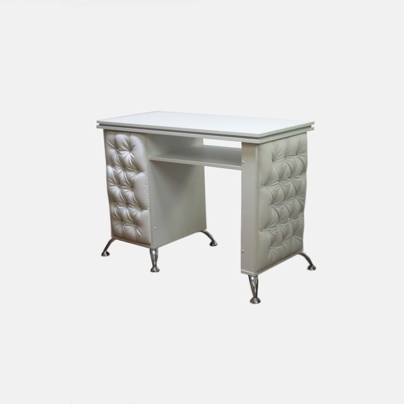 В стол можно установить встроенную вытяжку, на поверхности столешницы достаточно места для УФ-лампы, подставки для лаков, настольной лампы и прочего. В дизайне использована фирменная каретная стяжка, цвет которой, как и ДСП, можно выбрать индивидуально под свои требования.